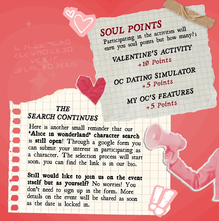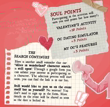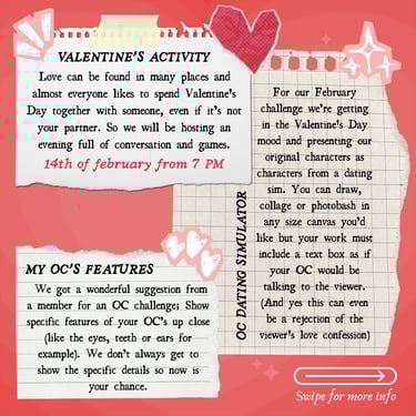 OC dating simulator: For our February challenge we’re getting in the Valentine's Day mood and presenting our original characters as characters from a dating sim. You can draw, collage or photobash in any size canvas you’d like but your work must include a text box as if your OC would be talking to the viewer. (And yes this can even be a rejection of the viewer's love confession :wink:). There will be a post in #challenges-and-crafts to post your submissions.