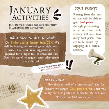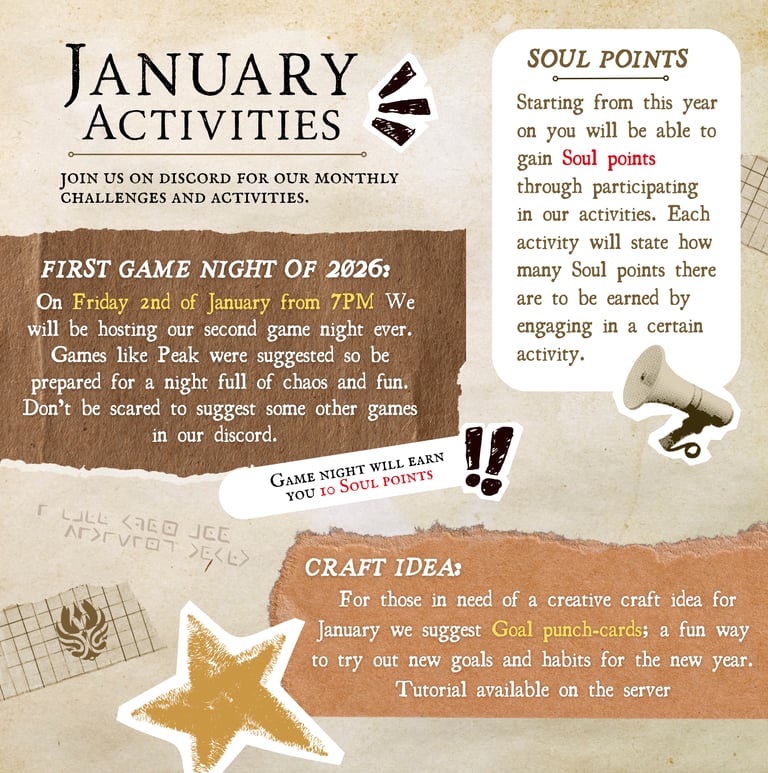 Starting from this year you will be able to gain Soul points through participating in our activities. Each activity will state how many Soul points there are to be earned by engaging in a certain activity. As this is just the start of this system the structure is still at its bare minimum and points have to be given manually. The score’s will be kept track of in a google sheets document which anyone will be able to view with the link.